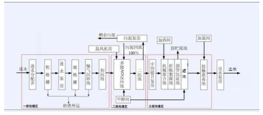 典型的污水廠處理工藝流程是上述方法的組合。以某一級a標準污水處理廠為例,從進水到出水主要分三級處理區,一級處理區主要應用物理法(包括攔截、沉淀、除砂等)及一定的化學法(初沉池前絮凝);二級處理區是污水處理工藝核心,主要是以活性污泥為主的生化反應(酶促反應);三級處理區主要應用物理化學法,通過混凝、過濾、消毒等工藝手段對污水進行深度處理。落實到具體處理工程中,各級各類技術需針對不同污染物和污染情況進行應用和改進。